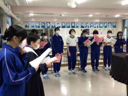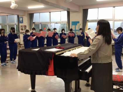 男声、女声のパートに分かれ、「今、咲き誇る花たちよ」の合唱練習が進んでいます。3年生に披露する日が楽しみです。