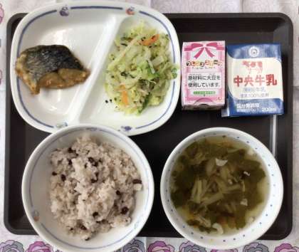 今日の献立は、「卒業祝い献立」で、沢煮わん、青菜あえ、鰆のから揚げ、米粉のケーキ(イチゴ豆乳クリーム)、赤飯、牛乳 でした。エネルギー:820kcal