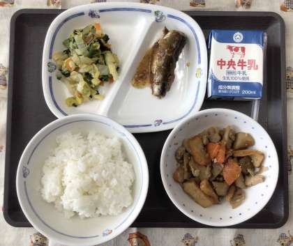 今日の献立は、筑前煮、おひたし、鰯の梅煮、ごはん、牛乳 でした。エネルギー:813kcal