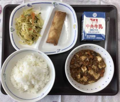 3/13 今日の給食 公開日 2024/03/13 更新日 2024/03/13 各学年から 今日の献立は、麻婆豆腐、拌三絲(バンサンスー)、愛知の野菜入り春巻き、ごはん、牛乳 でした。エネルギー:849kcal