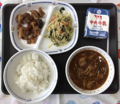今日の献立は、「たべまるのおすすめ献立」で、キムチ入りみそ汁、野菜のねりごまあえ、レバーとジャガイモの甘辛煮、ごはん、牛乳 でした。エネルギー:832kcal