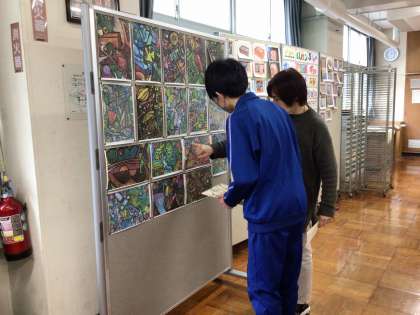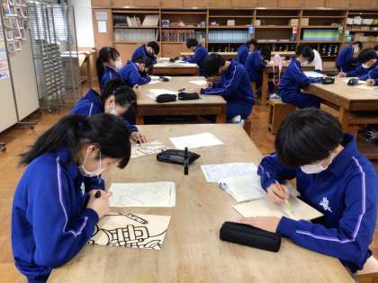 多色刷り版画の完成をイメージしながら、木版に下書きした図柄を太いマジックでなぞりました。版画は、刷り上がりまでどんな作品になるか予想ができないという楽しみが味わえるそうです。
