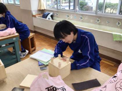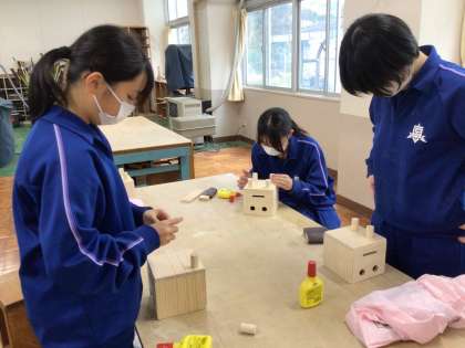 板の角をけずり、ボンドで足をくっつけて完成に近づいてきました。同じ材料、同じ作業工程でも、ちょっとずつ違う作品に仕上がることが、ものづくりの面白さの一つです。