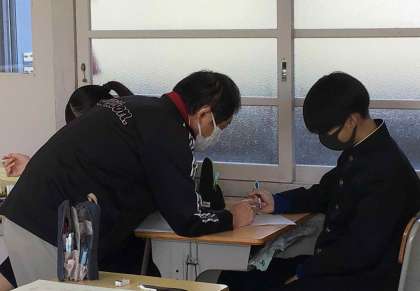 2年生の数学では、復習に取り組んでいます。計算問題を中心に、必ず解けるようにしておきたい問題をプリントで学習しました。教え合いながら「わかった、できた!」を感じられるようにしています。