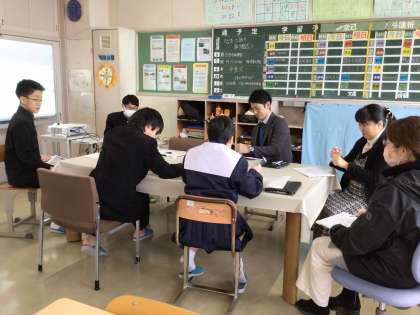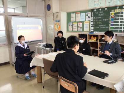 3・4組の生徒が、お楽しみ会を開きました。先生に関するクイズを学習用タブレットで作成して出題し合い、ヒントを出しながら先生たちと一緒に解きました。先生たちの珍解答が続出し、笑顔あふれる時間を楽しみました。