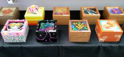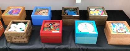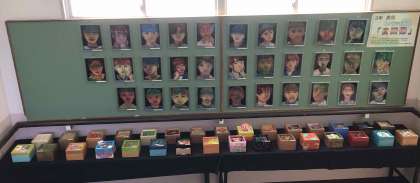 3年間の学びを生かした美術の作品です。箱の中には、石野中学校の校歌が流れるオルゴールが入っています。一人一人の思いが込められています。