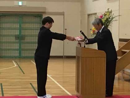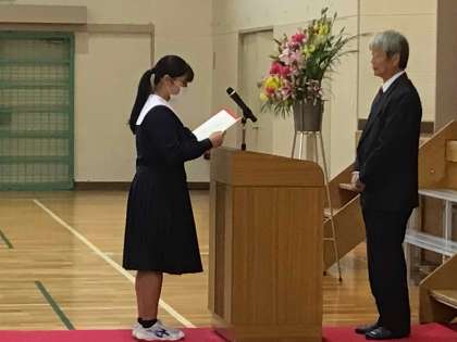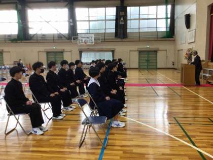 3年生が、石野中学校同窓会に入会する入会式を行いました。同窓会役員の方々に御臨席いただき、副会長の中根様よりお言葉をいただきました。石野のいいところをお話いただいた際には、うなずきながら話を聞く生徒の姿がありました。石野の発展に貢献したいという生徒代表の誓いの言葉のあと、卒業記念品をいただきました。