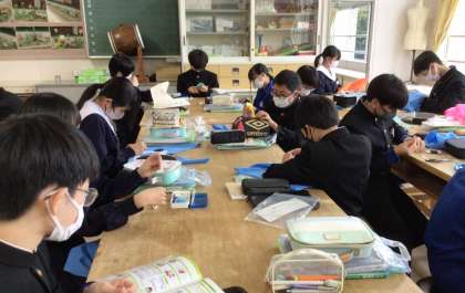 1年生の家庭科では、あずま袋の装飾に取り組みました。ボタンをつけ、好みに合わせた飾りつけをしました。縫い針を慎重に動かしながら、丁寧に作業を進めていました。