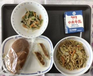 今日の献立は、焼きそば、ナムル、餃子、米粉パン、牛乳、でした。エネルギー:813kcal