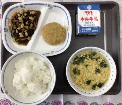 今日の献立は、かきたま汁、ひじきの炒め煮、ミンチカツ、ごはん、牛乳、でした。エネルギー:844kcal