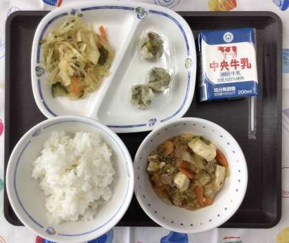 4/19 今日の給食 公開日 2024/04/19 更新日 2024/04/19 各学年から 今日の献立は、豆腐の中華煮、拌三絲(バンサンスー)、野菜入り焼売、ごはん、牛乳、でした。エネルギー:805kcal