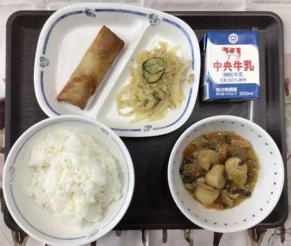 今日の献立は、ホタテの中華炒め、中華風酢の物、春巻き、ごはん、牛乳、でした。エネルギー:798kcal