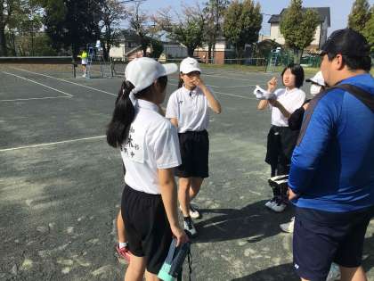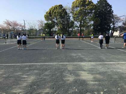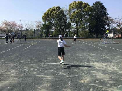 4月14日(日)、令和6年度の豊田市民総合体育大会が始まりました。ソフトテニス女子は、三好中学校で団体戦の試合を行いました。リーグ戦の初戦は、会場校の三好中学校です。