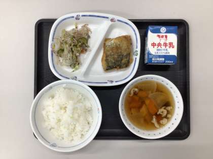 今日の献立は、かしわ汁、ゆかりあえ、鰆の香味ソースかけ、ごはん、牛乳、でした。エネルギー:814kcal
