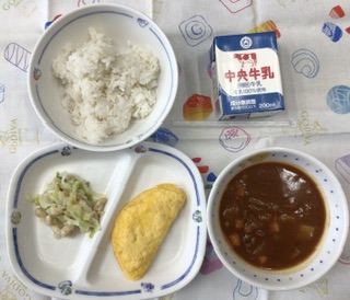 今日の献立は、ハヤシライス、ビーンズサラダ、オムレツ、麦ごはん、牛乳、でした。エネルギー:873kcal