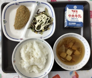 今日の献立は、けんちん汁、骨太サラダ(マヨネーズ風ドレッシング)青じそ入り鰺フライ、ごはん、牛乳、でした。エネルギー:814kcal