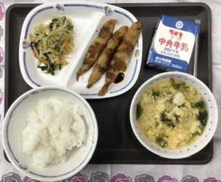 5/28 今日の給食 公開日 2024/05/28 更新日 2024/05/28 各学年から 今日の献立は、かきたま汁、アーモンドあえ、シシャモフライ(ウスターソース)、ごはん、牛乳、でした。エネルギー:806kcal