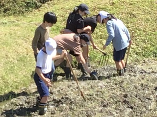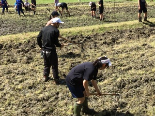 鈴木敏朗さんの指導のもと、2年生が田起こしをしました。泥に足を取られながらも、一生懸命くわを動かしました。