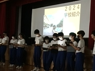 情報文化部の生徒が、部活動の時間に作ったスライドを用いて石野中学校紹介をしました。一生懸命に説明を聞く1年生の姿がありました。