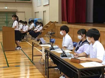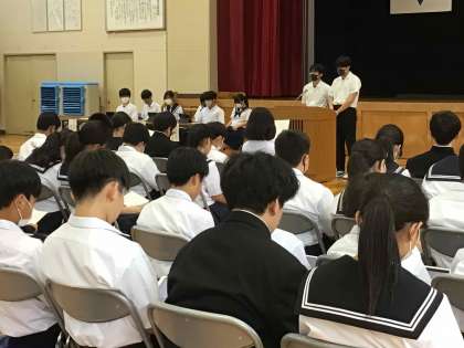 全校生徒による生徒会意見交換会が行われました。今年度の生徒会スローガンは「進歩」最高の仲間を本気で信じて突き進め!です。