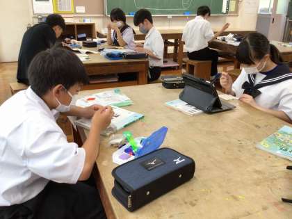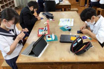 1年生の家庭科では、手縫いの練習をしています。今日は、まつり縫いにも挑戦しました。糸がからまってしまった生徒もいましたが、教え合いながら細かい作業に集中して取り組みました。