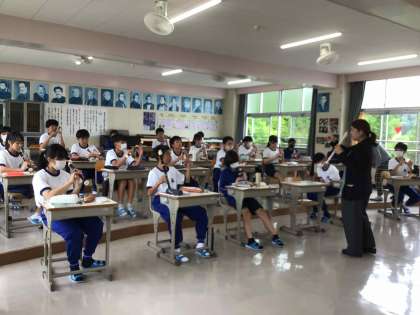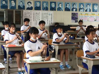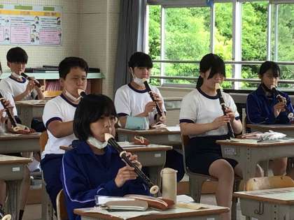 初めてアルトリコーダーを演奏する1年生。目を輝かせながら、ソプラノリコーダーとの違いを聞き、楽しそうに練習しました。