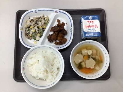 今週は、歯と口の健康週間メニューで、花麩のすまし汁、切り干し大根とひじきのサラダ(和風ドレッシング)、レバーと大豆のみそがらめ、ごはん、牛乳、でした。エネルギー:885kcal