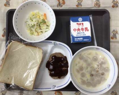 今日の献立は、豆3のスープ、アーモンドサラダ、ハンバーグサンド(中濃ソースサンド用)、スライスパン、牛乳、でした。エネルギー:826kcal