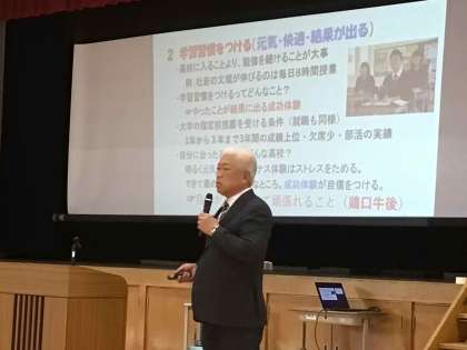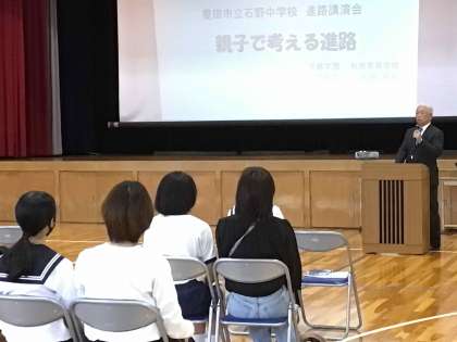 元石野中学校長で杜若高等学校に勤務されている加藤勝広先生を講師にお招きし、「親子で考える進路」と題した講演会を開催しました。具体的な数値を示しながら講演いただき、学習に対する姿勢を見直し、進路選択の視点を見直すよい機会になりました。