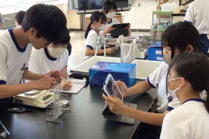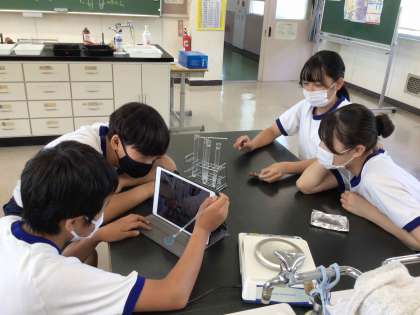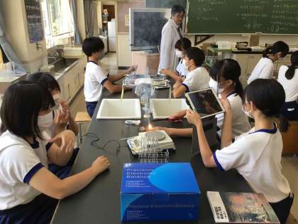 2年生の理科では、金属を酸化させる実験を行い,結果の記録や整理を通して化学反応式にまとめる学習をしています。生徒は、金属が燃焼する様子に驚き、目を輝かせながら観察していました。
