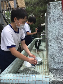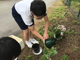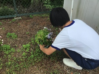 4月から教室に飾り世話をしてきたサイネリアが枯れたため、片付けをしました。土に戻し、鉢を洗う作業はを通して、勤労について意識できるようにしています。
