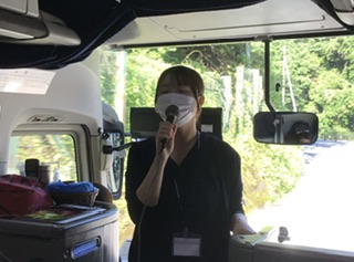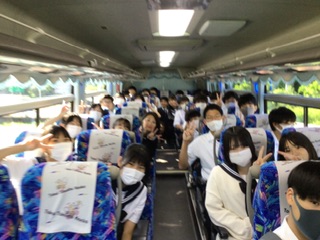 好天に恵まれ、バスは予定通り出発しました。生徒の笑顔も輝いています。バスの運転手さん、旅行社の方、バスガイドさんのあいさつをいただきました。