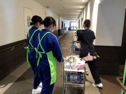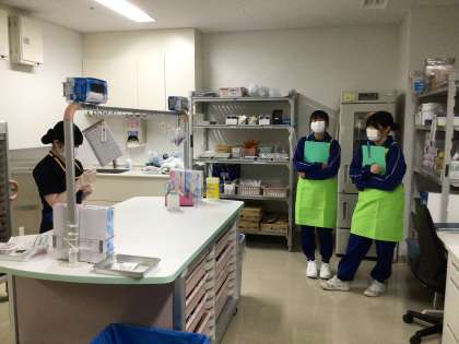 足助病院の看護部では、看護師の仕事の一日の流れの説明を受けたり、病室に必要な物品を運んだりしていました。