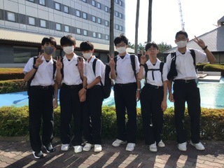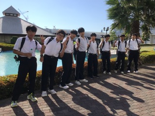 朝食を食べ終え、ホテルの中庭に集合して舞浜駅に向かいます。班別行動です。携帯電話を班に一台渡し、出発です。