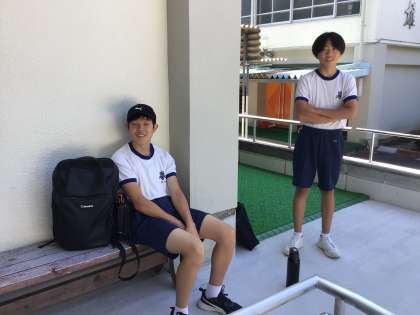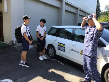 この写真は、自衛隊の職場体験に出発する生徒たち二人です。
