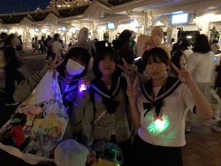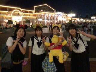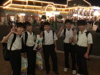 今朝は曇り空ですが、傘は必要なさそうな天気です。生徒はまだ眠そうですが、朝食に向かう準備をしています。昨日のディズニーランドでの帰り際の様子を添付します。