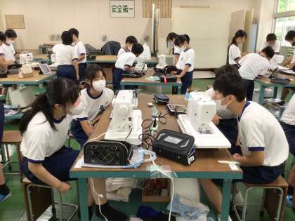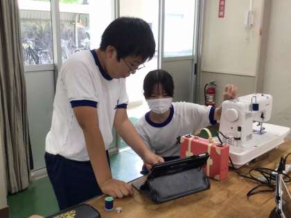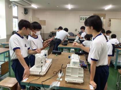 1年生の家庭科では、ミシンの使い方を学習しています。学習用タブレットで操作方法を確認しながら、下糸を巻きました。小学校でも学んできている内容ですが、自力で操作をすることは新鮮なようで、ボビンが回り始めると「おお!」という声があがりました。