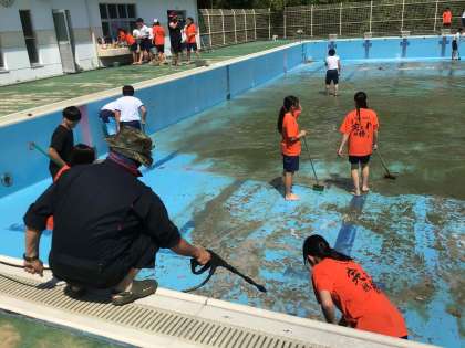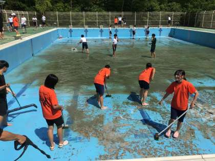 3年生が中心となって、プールの掃除をしました。素足で歩くとやけどをしそうなくらい熱いプールサイドでしたが、楽しそうに掃除をする3年生の姿がありました。学生ボランティアの河野さんも、生徒と一緒に活動しました。