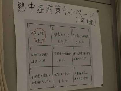 6月にもかかわらず、夏日が記録されることがあるほど気温が高くなる日があり、熱中症防止のため生徒の体調管理を徹底しています。部活動や体育の授業の前には健康チェックをしています。保健委員が中心となり、生徒同士でも注意喚起しています。十分な睡眠、バランスのよい食事等、ご家庭でもご配慮ください。