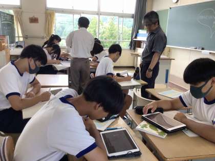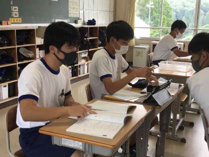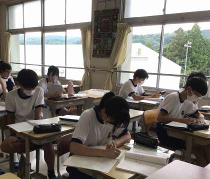 3年生は、数学で取り組んでいる自由進度学習に慣れてきました。分からないことがあると近くの生徒同士で相談し合ったり、解決するために活用しやすい教材を紹介し合ったりする姿が見られるようになりました。定期的にチェックテストを実施して、理解度を確認していきます。