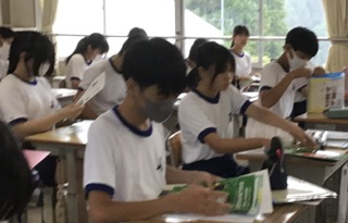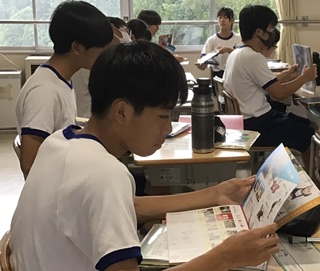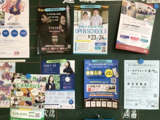 3年生教室の隣にある進路学習室には、多くの高等学校や専修学校に関する資料が置いてあります。オープンスクール等の情報は、生徒の目に届きやすいように掲示してあります。募集要項等を手にする3年生の表情は真剣です。興味がある学校には、まず体験入学をすることをおすすめしています。