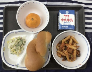 7/ 4 今日の給食 公開日 2024/07/04 更新日 2024/07/04 各学年から 今日の献立は、ナスとペンネのトマト煮、ツナサラダ、冷凍みかん(生)、ツイストパン、牛乳、でした。エネルギー:810kcal
