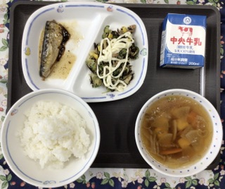 今日の献立は、「たべまるのおすすめメニュー」で、かみなり汁、骨太サラダ(マヨネーズ風ドレッシング)、鰯のしょうが煮、ごはん、牛乳、でした。エネルギー:806kcal