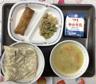 7/16 今日の給食 公開日 2024/07/16 更新日 2024/07/16 各学年から 今日の献立は、豚骨ラーメン、ナムル、春巻き、コーヒー牛乳の素、中華麺、牛乳、でした。エネルギー:787kcal