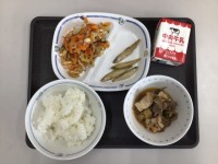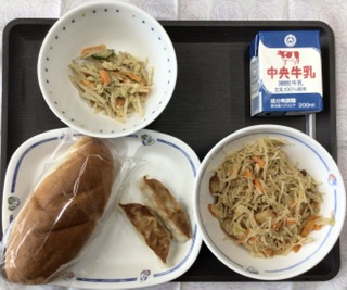 今日の献立は、炒めビーフン、ごぼうサラダ、餃子、ごはん、牛乳、でした。エネルギー:812kcal