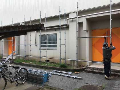 雨が降ると、体育館は雨漏りし困っていました。本校体育館は、避難所にもなっているため、早急な修繕が必要でした。7月8日、雨漏り修繕工事のため、体育館周りに足場の設置が始まりました。業者の方には、生徒の安全に十分気を付けて工事を進めてもらいます。保護者・地域の皆様も、ご来校の際はお気を付けください。