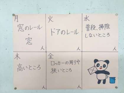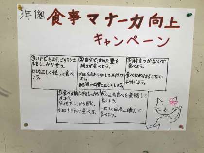 保健給食委員会では「食事マナーキャンペーン」を企画し、教室に掲示物を貼って取組を推進しています。清掃の強調ポイントも掲示されていました。