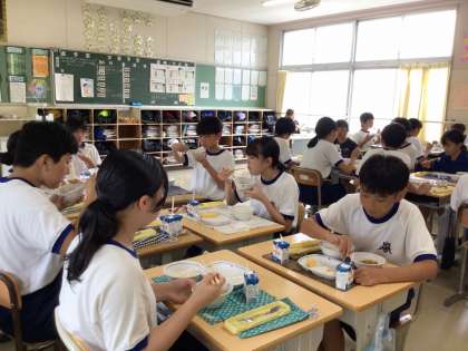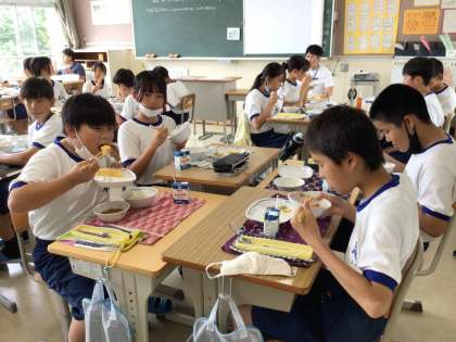 保健給食委員会の「食事マナー力向上キャンペーン」を受け、マナーを意識した会食ができています。1年生の様子を見に行くと、「食器は持たなくちゃね」と仲間にアドバイスする姿があり、キャンペーンの成果を感じました。