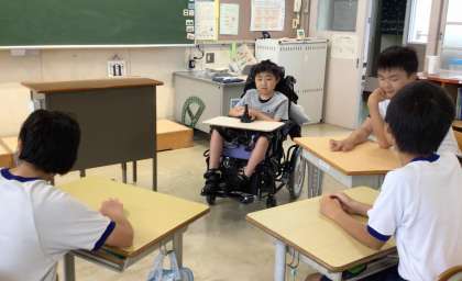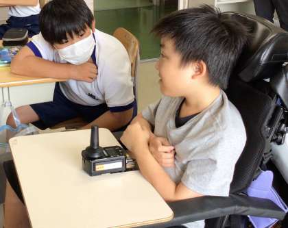 同じ小学校で学んだ仲間との交流学習を実施することができました。電動車いすの操作がとても上手です。3・4組と1年生の教室で2時間一緒に学習をしました。違う小学校から進学してきた生徒も、積極的にかかわる姿が見られ、交流学習のよさを感じました。