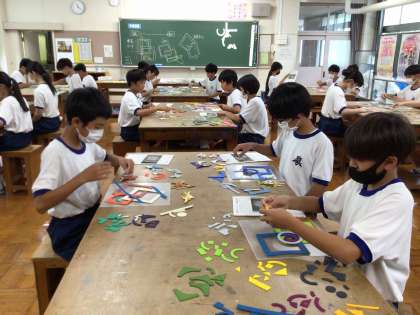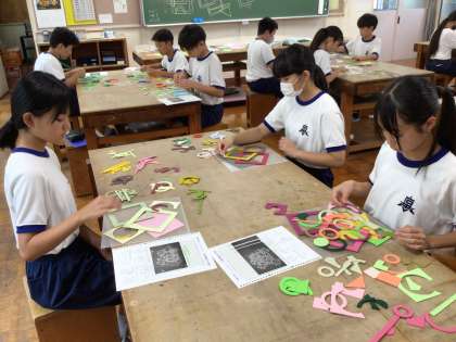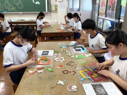 1年生の美術では、「季節を色で表す」をテーマにペーパーストラクチャーに取り組んでいます。生徒は、季節のイメージに合う構成を黙々と考え、様々な組み合わせを試していました。